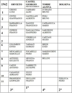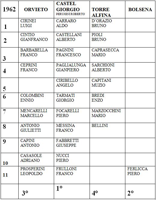 Nel 2019 grazie al lavoro fatto dal dr. Luca Giuliani nel riordino dell’ archivio Calistri, consultabile presso l’archivio Diocesano, abbiamo ritrovato un appunto utilizzato per il discorso della premiazione dove si fanno i complimenti alla squadra di Castel Giorgio per la brillante vittoria e alle altre squadre arrivate nell’ordine: Bolsena, Orvieto, Torre Alfina. Premio corridore più anziano,targa del CTG, a Muzio Capitani ( che ancora la conserva vedi foto) miglior frazionista a Franco Cintio.