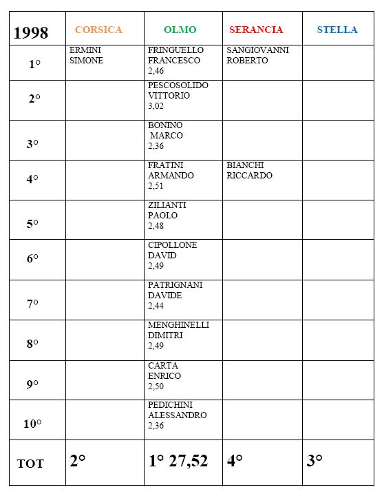 Archiviata la parentesi del ’97, quando la corsa non fu disputata a causa di alcuni dissapori nell’organizzazione, ritorna la Staffetta del Corpus Domini. L’Olmo, con una squadra ormai consolidata, ripete l’ottima prestazione del ’96. Pur dovendo sopperire a qualche defezione, come quella di Stefano Ferrari, a causa del cambio di residenza, la squadra dei verdi impone la sua supremazia sugli altri quartieri, anche se sarà una staffetta meno veloce rispetto a quella dell’anno precedente. Lotterà comunque fino all’ultima frazione contro un sorprendente Corsica 2°, battuto proprio sul filo di lana da Alessandro Pedichini, l’ultimo frazionista dell’Olmo, che taglierà stremato il traguardo dopo aver dato tutto se stesso lungo il percorso. Al terzo posto S. Maria della Stella e quarto il Serancia.