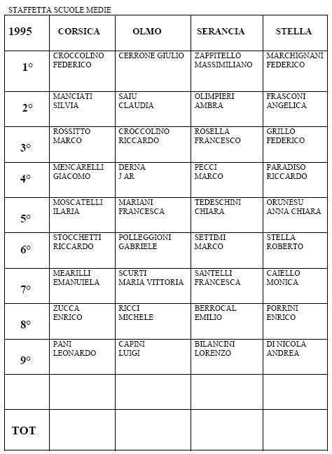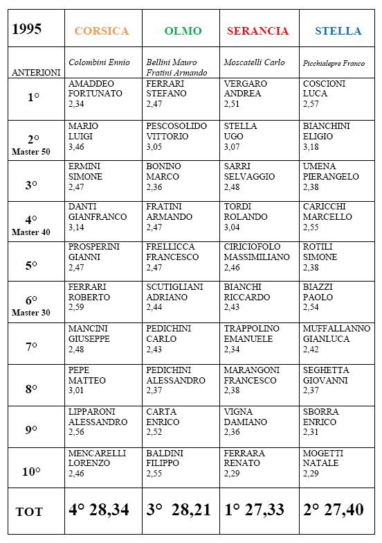 E’ una staffetta combattuta fin dalle prime frazioni. Parte forte il Corsica con Amaddeo Fortunato, poi passa a condurre l’Olmo, ma non riesce a mantenere la testa nelle ultime frazioni, durante le quali frazionisti del calibro di Enrico Sborra e Natale Mogetti per lo Stella, Damiano Vigna e Renato Ferrara per il Serancia, lottano per la vittoria ad un ritmo insostenibile per gli altri. E’ la conferma del Serancia ancora primo, che precede nell’ordine S.Maria della Stella, Olmo e Corsica.