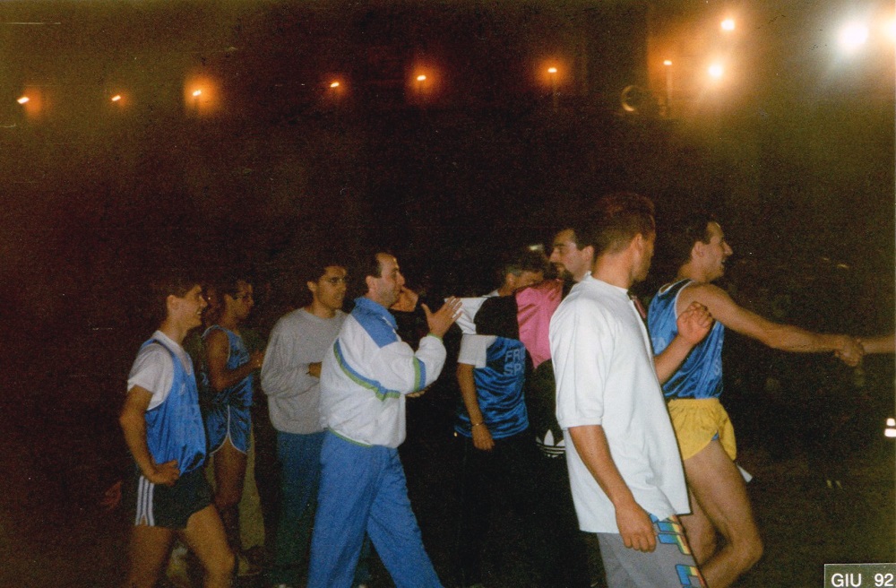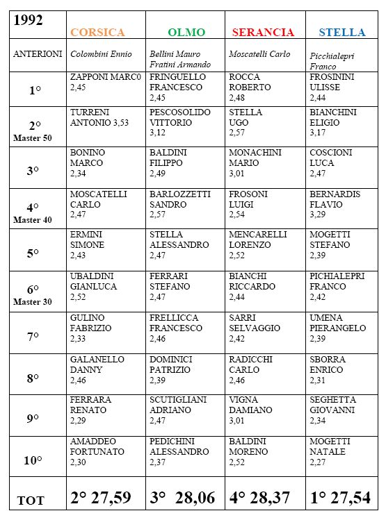 1992La SMEF, vincitrice dell’ultima edizione, abbandona la competizione e da allora in poi saranno solo le squadre dei 4 quartieri a misurarsi nella competizione. Comincia per l’Olmo l’epoca della doppia gestione, con a capo del quartiere i due Anterioni Mauro Bellini e Armando Fratini, che iniziano a porre in risalto la questione di un’equa suddivisione dei quartieri. Il Corsica infatti ha un territorio che include Ciconia, comprende parte di Orvieto Scalo e parte di Sferracavallo. Quest’ultima frazione secondo i due sarebbe invece in territorio Olmo. La disputa si fa accesa, anche perché c’è un atleta conteso: Marco Bonino, che risiede a Sferracavallo ma correrà ancora un anno con il Corsica ( in 2’34). Questo forse impedirà all’Olmo di aggiuducarsi la gara, ma ciò non riuscirà a dare la vittoria al Corsica. Infatti dopo una staffetta combattuta ed un arrivo con tre frazionisti a distanza ravvicinata, vince lo Stella con Mogetti in 27’54” secondo il Corsica in 27’59” terzo l’Olmo in 28’06”.
