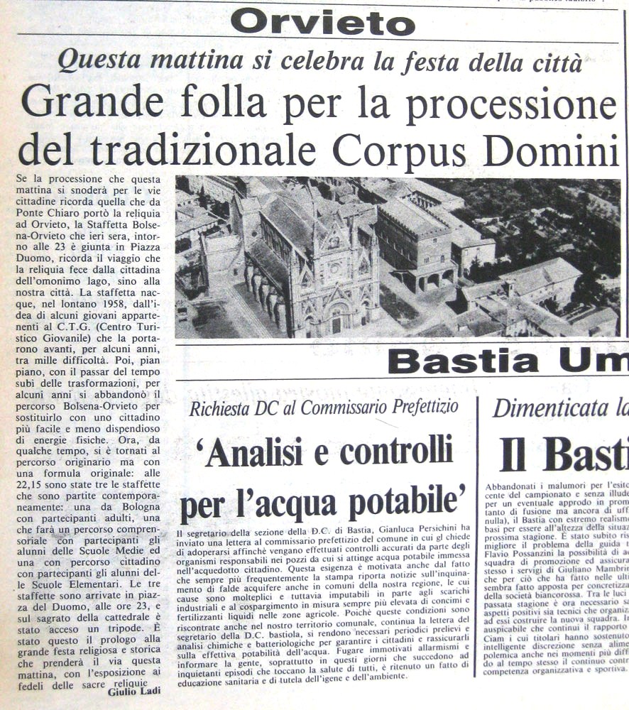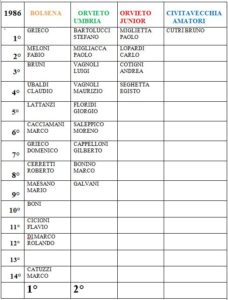Della staffetta 1986 abbiamo questo articolo di giornale, che parla di una partenza contamporanea di tre staffette elementari medie e adulti, in questo anno si chiama Staffetta del Comprensorio: partecipano 4 sole squadre Lazio-Bolsena, Umbria-Orvieto, Orvieto junior, Civitavecchia Amatori.