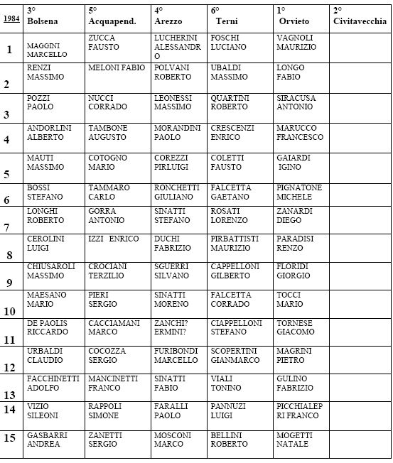 Orvieto, Bolsena, Arezzo, Terni, Acquapendente, Civitavecchia. Vi sono atleti di spicco come Maurizio Vagnoli che sarà campione italiano Master di maratona, i fratelli Sinatti di Arezzo, ma l’ atletica orvietana mette in mostra i suoi atleti, Picchialepre, Gulino, Mogetti Natale e vince ancora 2° Civitavecchia, 3° Bolsena, 4° Arezzo, 5° Acquapendnte, 6° Terni nonostante abbia tra le sue fila Tonino Viali nazionale degli 800 e 1500 metri.