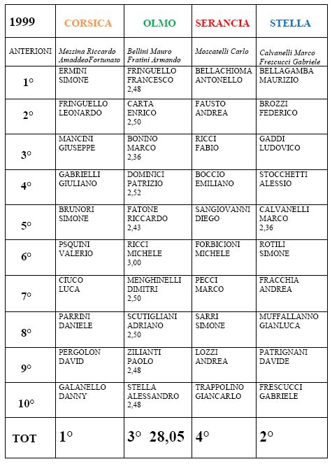 1999A partire da questa edizione vengono tolti i Master. L’ Olmo ne risulta danneggiato in quanto deve sostituire i tre atleti più forti. Non solo: anche Davide Patrignani, componente della squadra vincitrice l’ anno precedente, cambia residenza e correrà per Stella e l’Olmo non riuscirà a sostituirlo degnamente.  Anterioni del S.Maria della Stella i giovani Gabriele Frescucci e Marco Calvanelli, che daranno anche in gara un decisivo contributo al loro quartiere.