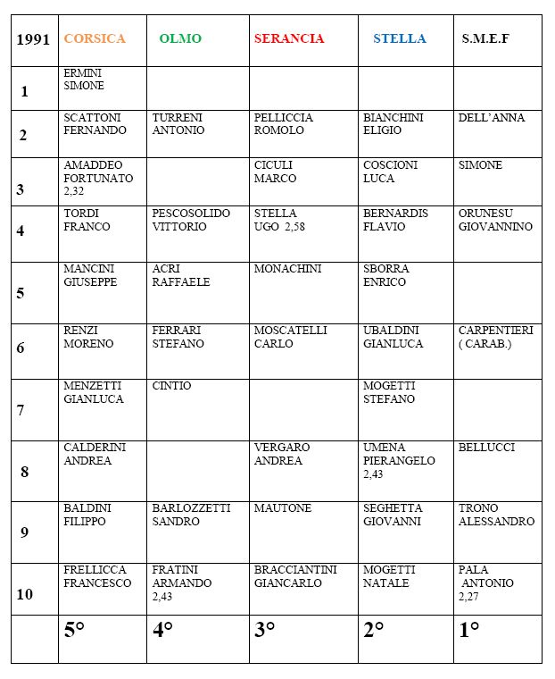 E’ l’anno in cui la SMEF riesce, dopo anni di inseguimento, ad aggiudicarsi la gara. Per la prima volta vengono inserite tre frazioni corse da master la 2° corsa da over 50 la 4° da over 40 e la 6° da over 30. Per il cambio di residenza Natale Mogetti passa al quartiere S. Maria della Stella e questo indebolirà la compagine del Corsica. La SMF quindi con Pala Antonio in 2,27 chiude al 1° posto seguita dallo Stella, poi Serancia, Olmo, con il Corsica addirittura all’ultimo posto.