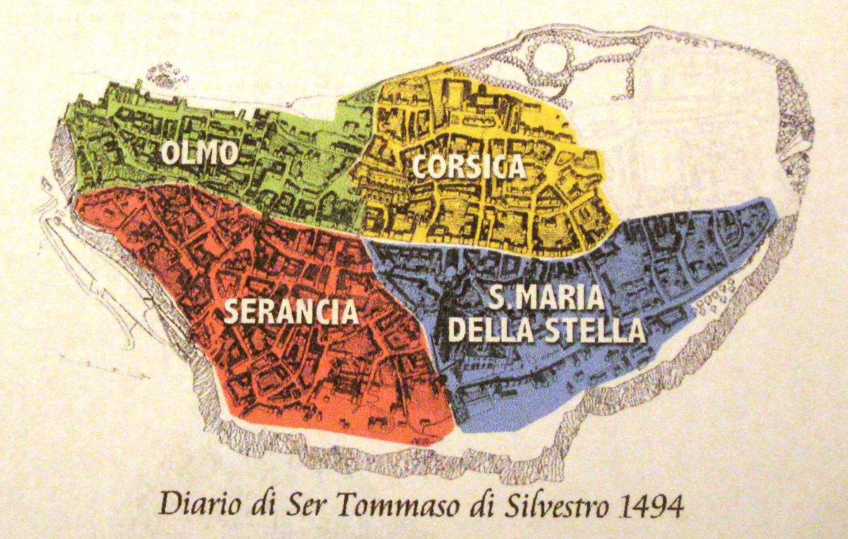 · Alla fine del XV° secolo i quartieri avevano assunto il nome e la disposizione che ancora oggi conosciamo, spartiti regolarmente dal crocevia sotto la Torre del Moro : Santa Pace lato piazza del Popolo divenne Corsica, piazza S. Giovenale Olmo , S. Andrea e S. Giovanni Serancia e Postierla S. Maria della Stella. ( Vedi piantina Diario di Ser Tommaso di Silvestro del 1494).