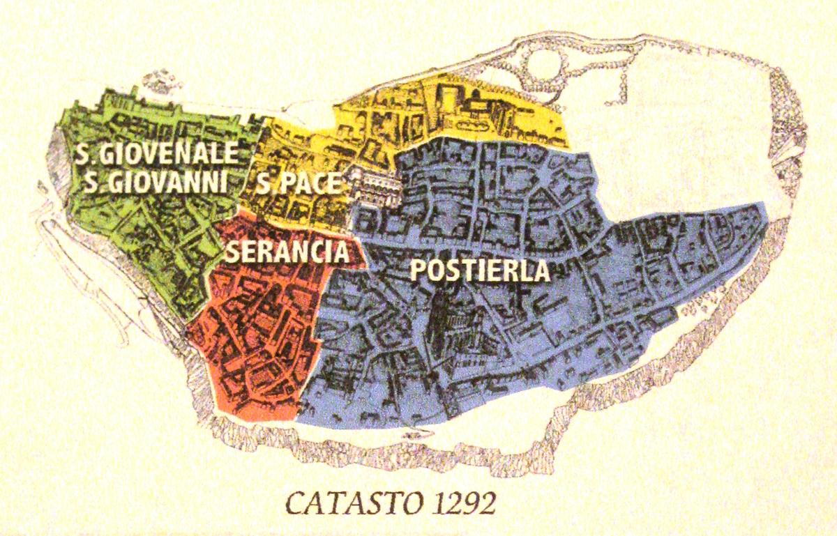 · Gli insediamenti urbani, localizzati inizialmente nella parte ovest della rupe dove si trovava l’antica porta di accesso, si estesero nel 13° secolo su gran parte della sua superficie, fino a raggiungere quell’assetto che caratterizzerà la città : una croce di strade al centro, con la piazza con gli edifici principali che in quel tempo erano il Palazzo Comunale e la chiesa di S.Andrea ( usata per le cerimonie ufficiali).. In quest’epoca di grande splendore, la città si distingueva per l’eccellente organizzazione interna a livello istituzionale e sociale, riflessa in una ordinata suddivisione dei quartieri, all’epoca 4: il più grande era Postierla che comprendeva 9 rioni, poi Serancia, San Giovenale, e Santa Pace con 4 rioni ciascuno. ( Come da pianta del Catasto del 1292).