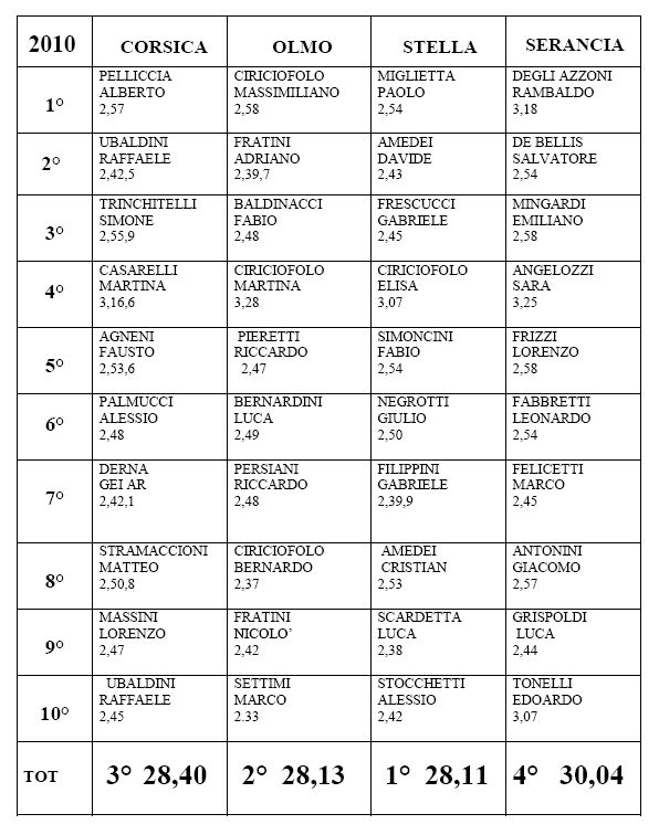 2010Era tra favoriti ma ha dovuto sudare più del previsto lo Stella per aggiudicarsi la Staffetta dei Quartieri 2010 che l’ha vista trionfare solo nei metri finali dopo un avvincente sprint nell’ultima frazione con l’Olmo. Davvero una serata bellissima nella straordinaria cornice di Piazza Duomo dove tantissime persone hanno seguito l’edizione numero 45 della storica manifestazione che ormai è nel cuore degli orvietani e che mette di fronte i quattro storici quartieri in un avvincente duello tra le vie della città colme di persone ad incitare i propri beniamini su un percorso che mette alla prova le loro abilità. Alle 21.30, come da programma, la prima gara ha visto sfidarsi i più piccoli dei centri sportivi della Libertas che, ogni anno, partecipa puntale all’organizzazione e porta sulla piazza tanti bambini per dare una ventata di allegria e di colore all’evento, ed ha salutato la vittoria del Serancia. Subito dopo è stata la volta dei ragazzi delle scuole medie che si sono sfidati in un percorso di circa 500 metri che, tra saliscendi e curve a gomito, ha visto prevalere il quartiere che più è stato capace di distribuire le forze nelle dieci frazioni previste, il CorsicaAlle 22.30 è stata la volta della staffetta Assoluta e quà la tensione è iniziata ad aumentare, per gli atleti così come per i tanti spettatori assiepati lungo Via del Corso e all’ interno della Piazza Duomo pronti a seguire l’avvincete duello. Le previsioni davano  Stella, quale quartiere vincitore della passata edizione, e Olmo tra i favoriti e sicuramente non hanno deluso le attese e dandosi battaglia fino all’ultima frazione quando per soli due secondi il Santa Maria della Stella ha avuto la meglio sugli avversari. In ogni caso fino all’ottava frazione anche il quartiere Corsica ha provato a rimanere in scia deciso a difendere il prestigio di essere il più titolato tra i quattro con ben 15 edizioni vinte; peccato invece per il Serancia che ha perso il treno fin dalle prime battute senza essere poi capace di ricucire il gap. All’inizio la fuga dello Stella, che fin dalle prime battute ha iniziato a schierare i suoi pezzi pregiati con l’intenzione di correre una gara di testa e che, nella quarta frazione, grazie alla solita intramontabile Elisa Ciriciofolo ha segnato un solco che sembrava definitivo sui rivali. Ma quando sembrava tutto perso, una stellare ottava frazione di Bernardo Ciriciofolo in 2’37” rimette tutto in discussione recuperando 16” sul frazionista dello Stella Cristian Amadei capace comunque di un tempo di tutto rispetto. Nella nona frazione ancora un piccolo allungo del quartiere giallo-azzurro sui verdi dell’Olmo con Luca Scardetta che con il terzo tempo assoluto di 2’38” consegna ad Alessio Stocchetti il testimone un vantaggio di 11” da gestire nell’ultima su Marco Settimi, in una riedizione del grande duello dell’edizione 2009. Sono gli ultimi 940 metri i più spettacolari e avvincenti dell’intera serata quando i due grandi amici-rivali si danno battaglia in una lotta all’ultimo colpo che ha visto quest’ultimo capace di raggiungere il suo avversario poco prima della Torre del Moro iniziando poi uno sprint negli ultimi 250 metri condotti su ritmi elevatissimi. Qui la classe, l’esperienza e la maggiore freschezza del portacolori dello Stella ha avuto la meglio sull’atleta dell’Olmo che ha tagliato il traguardo con soli due secondi di distacco tra gli applausi dei suoi sostenitori e non solo per la grande prestazione che gli è valsa il miglior tempo della serata, 2’33”.