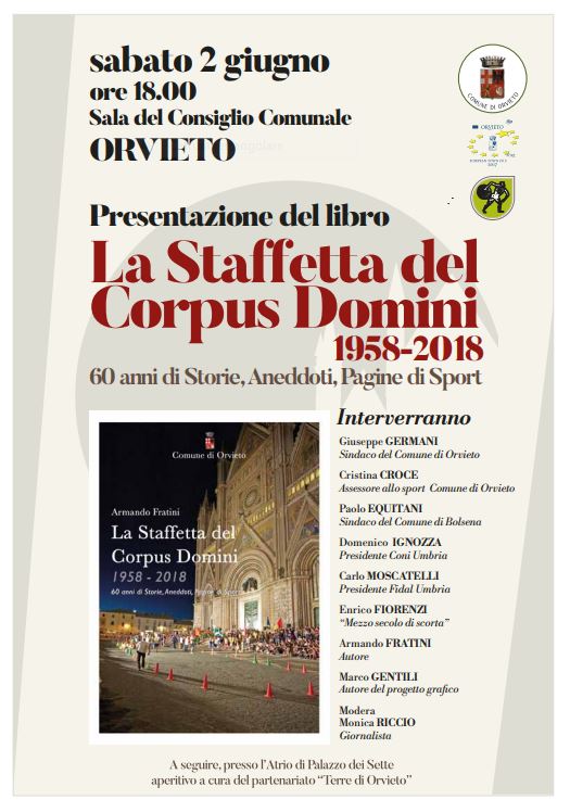 La Staffetta del 60° è preceduta alle ore 18,00 -nella sala del Consiglio Comunale- dalla presentazione del libro “La Staffetta del Corpus Domini – 60 anni di storie, aneddoti, pagine di sport”. Presenti: il sindaco Giuseppe Germani; il Presidente del Coni Regione Umbria, Domenico Ignoza; l’assessore allo sport, Cristina Croce. Assente Carlo Moscatelli, in rappresentanza della Libertas Orvieto il presidente, Sergio Viola; Marco Gentili, curatore del progetto grafico, e moderatrice dell’incontro, la giornalista Monica Riccio della testata Orvieto Sport. Presente in sala Prisca Taruffi, figlia del vincitore dell’ultima Mille Miglia. Sala piena di ex atleti e appassionati che attendono il momento di ritrovarsi nelle numerosissime foto e nelle pagine del libro e rivivere momenti di amicizia e di sport legati anche alla loro gioventù. Tutti hanno acquistato una o più copie dando un’offerta minima di 15 euro, che contribuirà, nell’ambito del progetto Art Bonus, al restauro del Portico di S. Andrea.