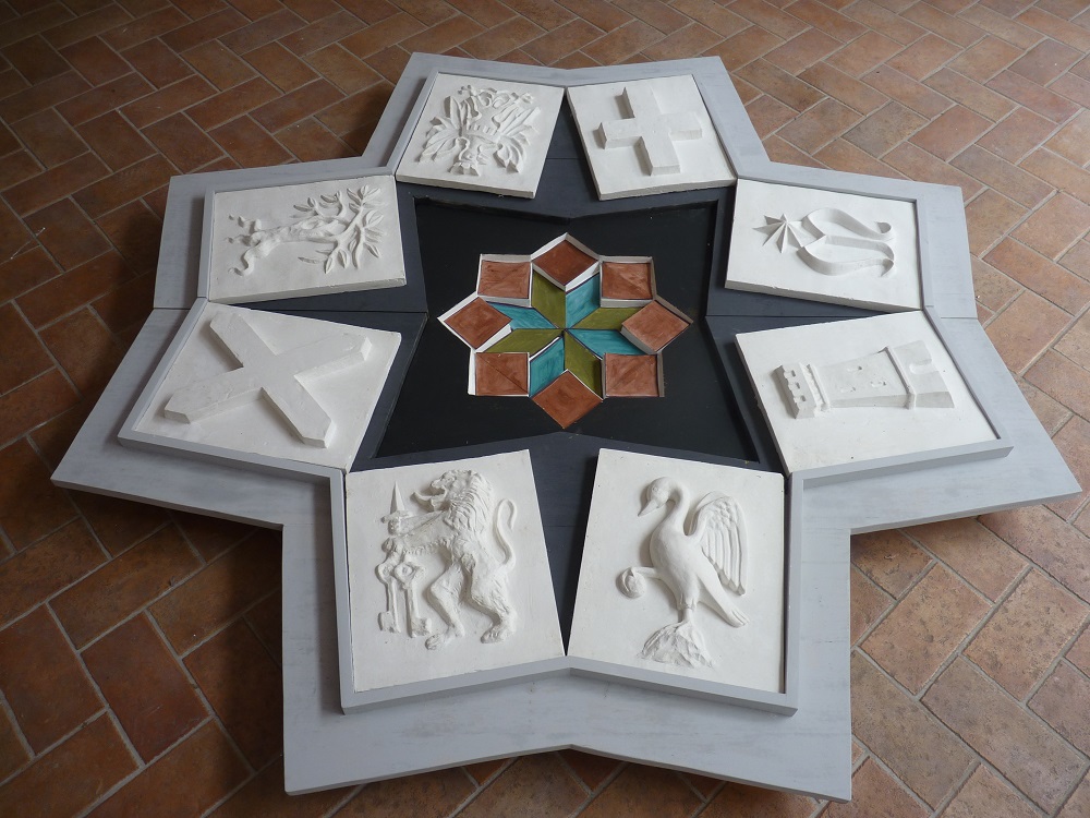 Otto formelle acrome, in gesso bianco, per corolla. Senza il peso dei colori, ma prepotentemente identitari. Raffigurano i rami nodosi dell’Olmo, la croce traversa del Serancia, la solida torre del Corsica e l’elegante astro del Santa Maria della Stella. E poi l’Aquila incoronata, l’Oca con la palla nella zampa destra, il Leone rampante che tiene la spada e la chiave di San Pietro e la Croce.